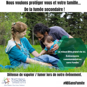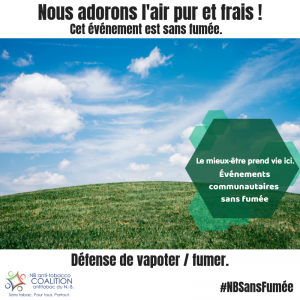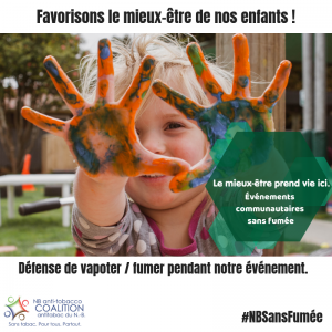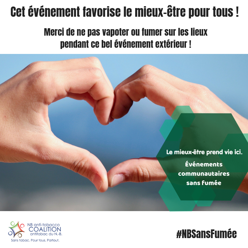 Les activités extérieures représentent une excellente possibilité d’activités et d’engagement communautaires. La plupart des Néo-Brunswickois ne désirent pas respirer la fumée secondaire. Tenir les événements extérieurs à l’abri de la fumée protège les gens, surtout les enfants, contre l’exposition à la fumée secondaire dangereuse.